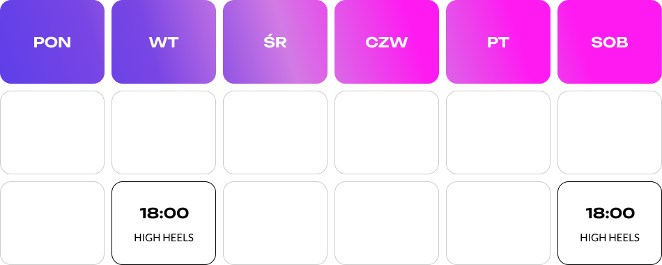 Zajęcia na wysokich obcasach to zabawne i wzmacniające zajęcia taneczne, które koncentrują się na rozwijaniu pewności siebie, siły i wdzięku podczas noszenia wysokich obcasów. Zajęcia łączą w sobie elementy różnych stylów tanecznych, takich jak jazz, hip hop i burleska, tworząc wyjątkowe i ekscytujące doznania treningowe. Te zajęcia, odpowiednie dla tancerzy na wszystkich poziomach, pomagają uczniom rozwinąć własny styl, jednocześnie poprawiając postawę, równowagę i koordynację. Niezależnie od tego, czy chcesz poprawić swoje umiejętności taneczne, czy po prostu chcesz się dobrze bawić podczas ćwiczeń, zajęcia na wysokich obcasach to idealny wybór.