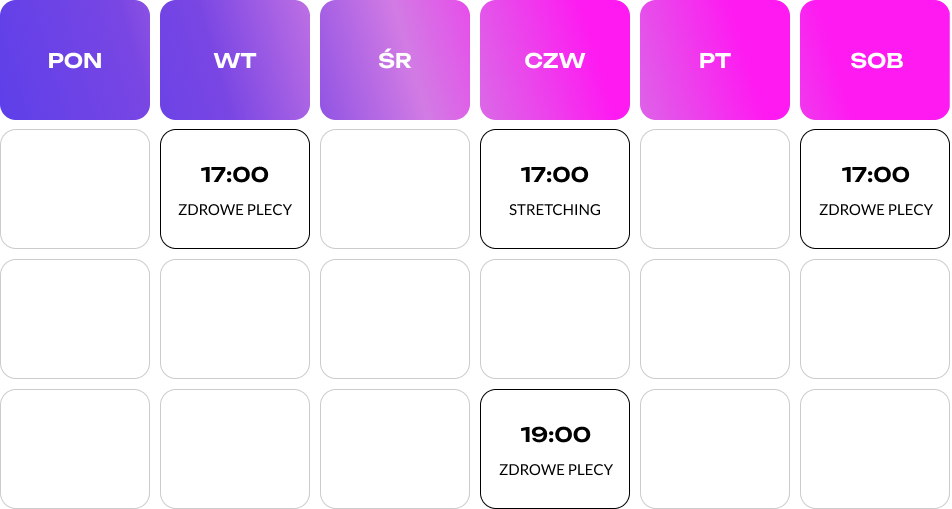 Zwiększ swoją elastyczność: nasi doświadczeni instruktorzy poprowadzą Cię przez różnorodne ćwiczenia rozciągające zaprojektowane tak, aby były ukierunkowane na wszystkie obszary ciała. Niezależnie od twojej kondycji fizycznej, nasze zajęcia rozciągania są idealne dla każdego, kto chce poprawić zakres ruchu.