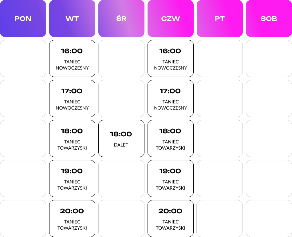 Zwiększ swoją elastyczność: nasi doświadczeni instruktorzy poprowadzą Cię przez różnorodne ćwiczenia rozciągające zaprojektowane tak, aby były ukierunkowane na wszystkie obszary ciała. Niezależnie od twojej kondycji fizycznej, nasze zajęcia rozciągaNasza szkoła oferuje różnorodne zajęcia taneczne, w tym Latino solo, salsa solo, bachata i balet. Nasza klasa Latino solo koncentruje się na muzyce latynoamerykańskiej, ruchach i technikach, pozwalając tancerzom wyrazić swój indywidualny styl i rytm. Na naszych lekcjach salsy solo tancerze uczą się podstawowych kroków i zwrotów tego energetycznego i zmysłowego stylu tanecznego, podczas gdy nasze zajęcia z Bachaty kładą nacisk na muzykalność i romantyczne ruchy tańca. Dla tych, którzy szukają bardziej klasycznego stylu, nasza klasa baletu zapewnia podstawy w zakresie techniki, wyrównania i wdzięku, zaspokajając potrzeby tancerzy na wszystkich poziomach. Dołącz do nas i odkryj radość z tańca w naszej tętniącej życiem i wspierającej się społeczności.nia są idealne dla każdego, kto chce poprawić zakres ruchu.